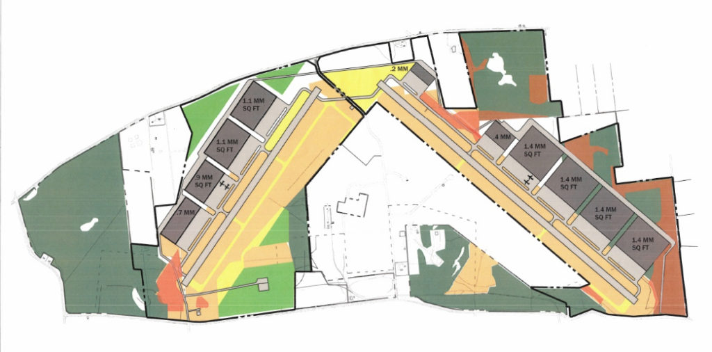 The Calverton Habitat Review, submitted to the Department of Environmental Conservation, shows a massive construction project: 10 new buildings along the two runways, with a total of 10 million square feet.