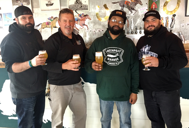 Caption: Sage (from left), Vandenburgh, Greenport head brewer Pat Alfred and LaMaina toast the launch of Lucha Lager in May.