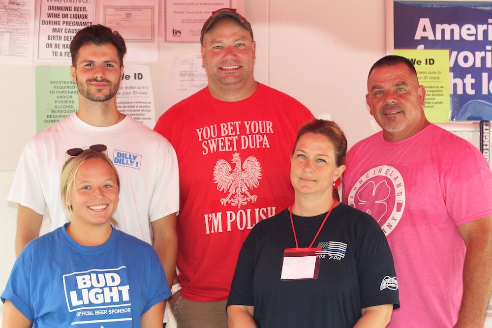 Rich Kolodziejski of Riverhead, Mark Buczynski of Riverhead, Joseph Sawicki of Southold, Cathy and Tom Stasiukiewicz of Aquebogue, and Tom Najdzion of Riverhead (RPIC Director) at Riverhead Polish Independence Hall. (Elizabeth Wagner photo)