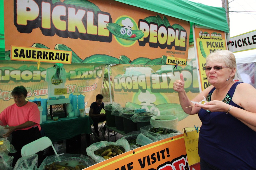 Olya Machen of Old Bethpage enjoys a pickle from the Pickle People. (Elizabeth Wagner photos)