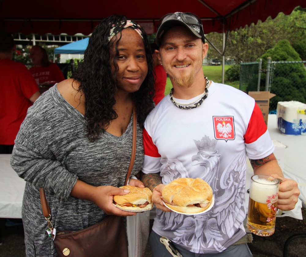 Selden’s Christina Anicet and Michael Uresk enjoy beer and kielbasa sandwiches. (Elizabeth Wagner photo)