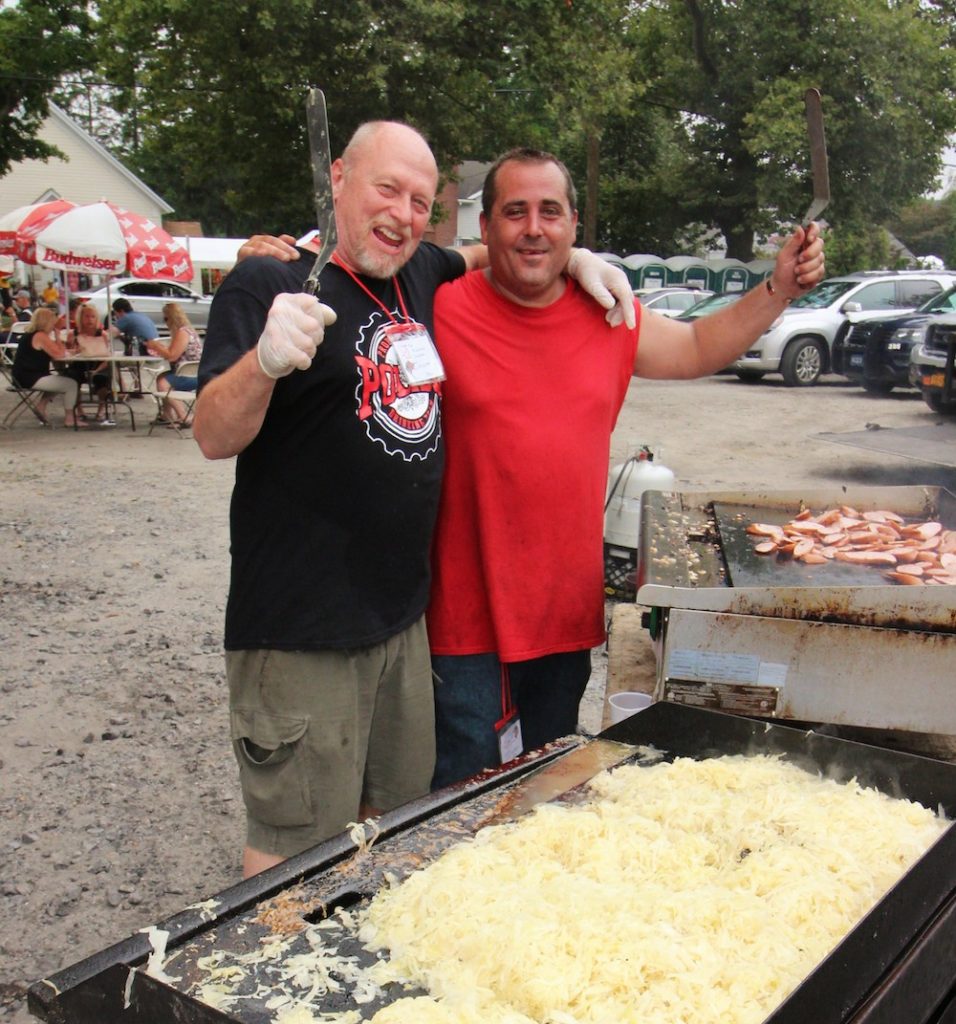 Tom Mielnicki of Flanders and Scott Szczepanik II of Riverhead grill up kielbasa and onions. (Elizabeth Wagner photo)