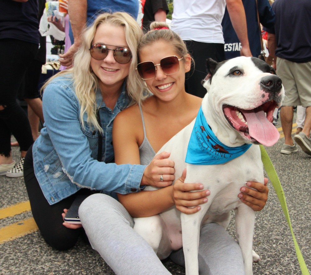 Riverhead’s Megan Hill and Sarah Nine cuddle 2-year-old Ace, a bulldog/boxer mix available for adoption through Last Chance Animal Rescue. (Elizabeth Wagner photo)