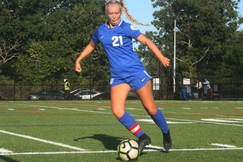 Photo caption: Megan McIntosh, a senior central defender, may have been the busiest player on the field for Riverhead in its 3-0 loss to Walt Whitman. (Credit: Bob Liepa)