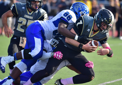 Photo caption: Riverhead’s Deontae Sykes (88) and Rayvon Moore bring down Commack quarterback Aidan McCarthy. (Credit: Robert O’Rourk)