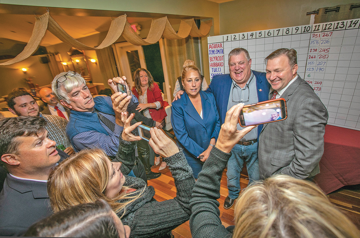 Photo caption: GOP winners Yvette Aguiar, Tim Hubbard and Frank Beyrodt pose for photos during the celebration on election night. (Credit: John Griffin)