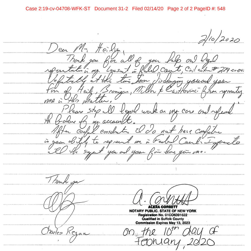 Mr. Regan submitted a written letter to the Holbrook-based firm representing him, Heilig, Branigan & Miller LLP, on Monday, Feb. 10. In the letter, he stated that “after careful consideration,” he “does not have confidence in your ability to represent me in Federal Court.”