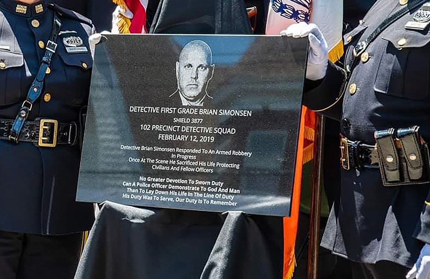 The plaque will be displayed in the 102nd Precinct squad room inside a handcrafted wooden shadow box dedicated to Det. Simonsen’s memory. The shadow box was crafted by Pat Roche and now includes other donated memorabilia.
