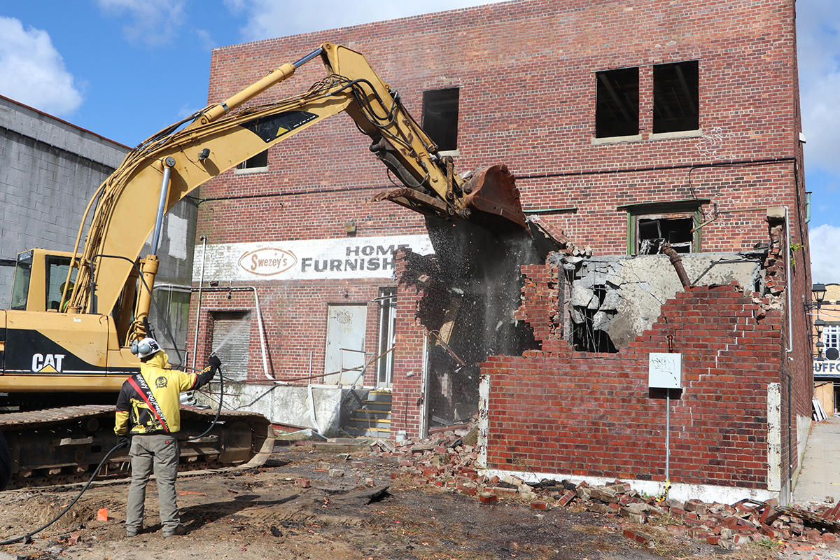 The demolition started with the furniture store, which most recently served as an indoor farmers market but had been vacant for several years, and will continue east to the former bike shop.