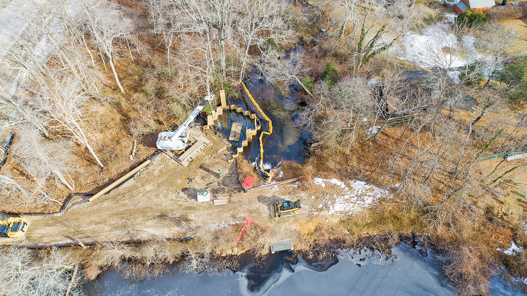 Construction began at the end of December on a nearly $1 million fish passage project that is expected to restore “critical spawning and maturation habitat for river herring and American eel” and provide a major boost to the local marine ecosystem. The project is a partnership with the DEC, Peconic Estuary Partnership, Southampton Town and Suffolk County.